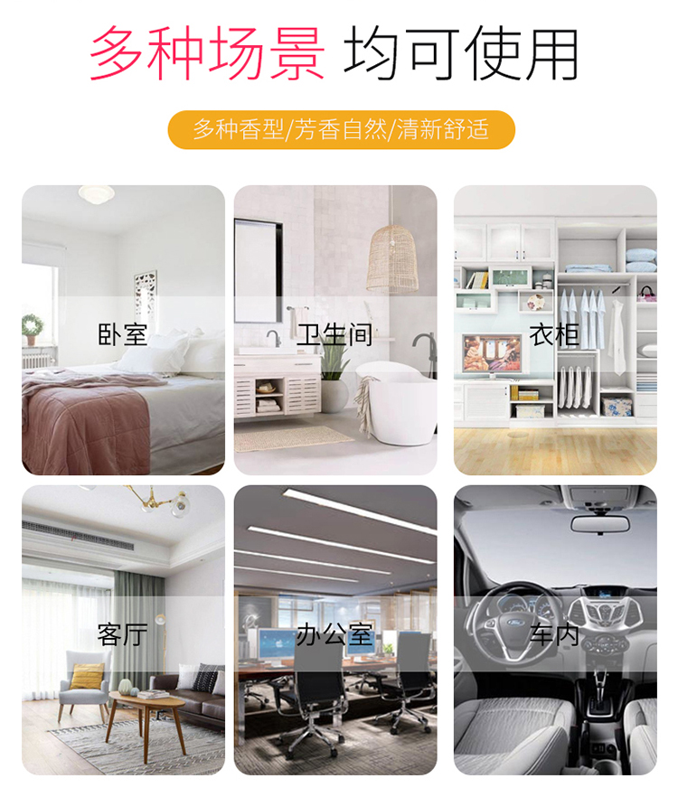 適應范圍:客廳、廚房、洗手間、衣櫥、辦公室、汽車、酒店、賓館、KTV等公共場所,有需要空氣清新芳香的地方都可以使用。